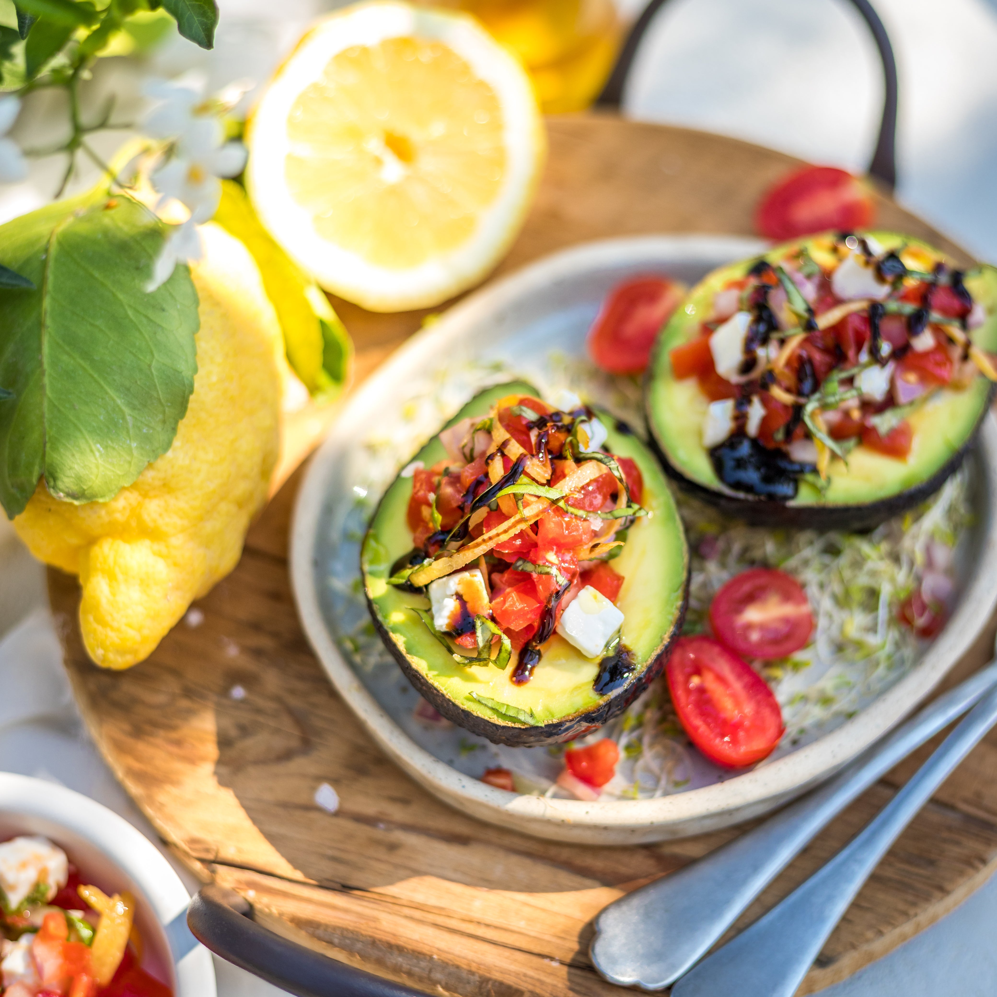 Sprinkle with lemon or lime to keep the color bright, scoop out some flesh with a spoon and add it to the rest of the ingredients.