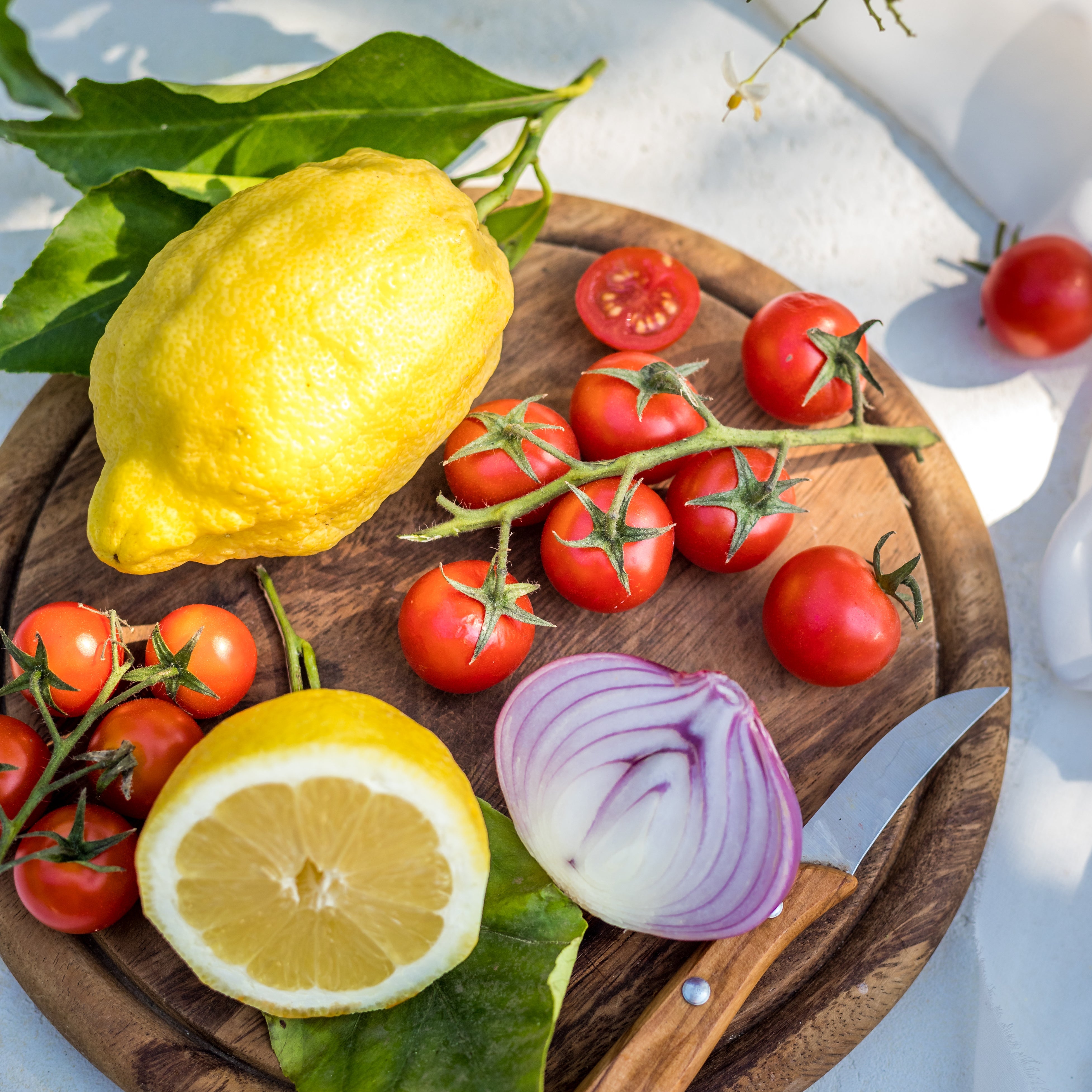 Add the finely sliced onion, the olives, diced cheese and the cherry tomatoes cut in half and drained of their juice. Store in the refrigerator until serving.