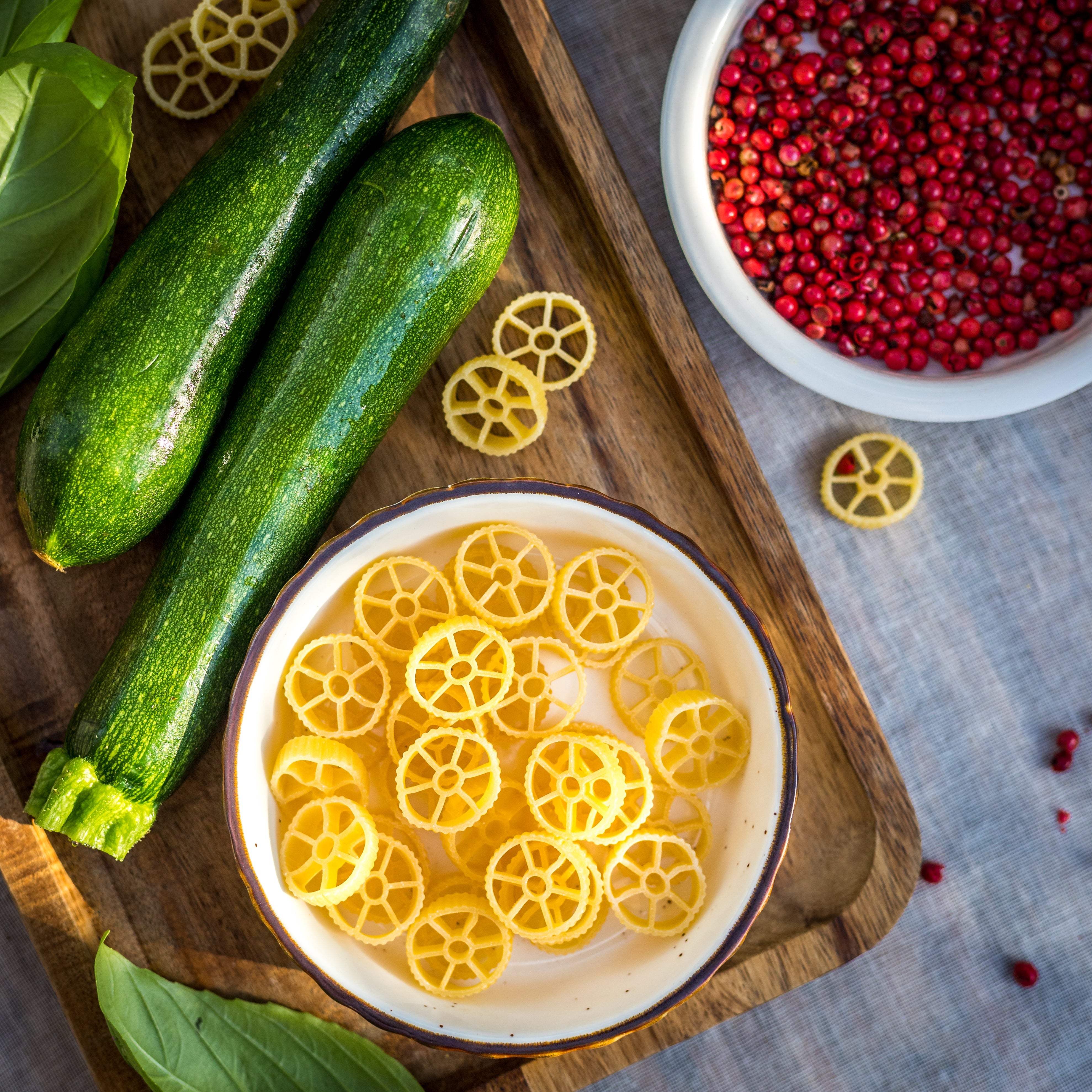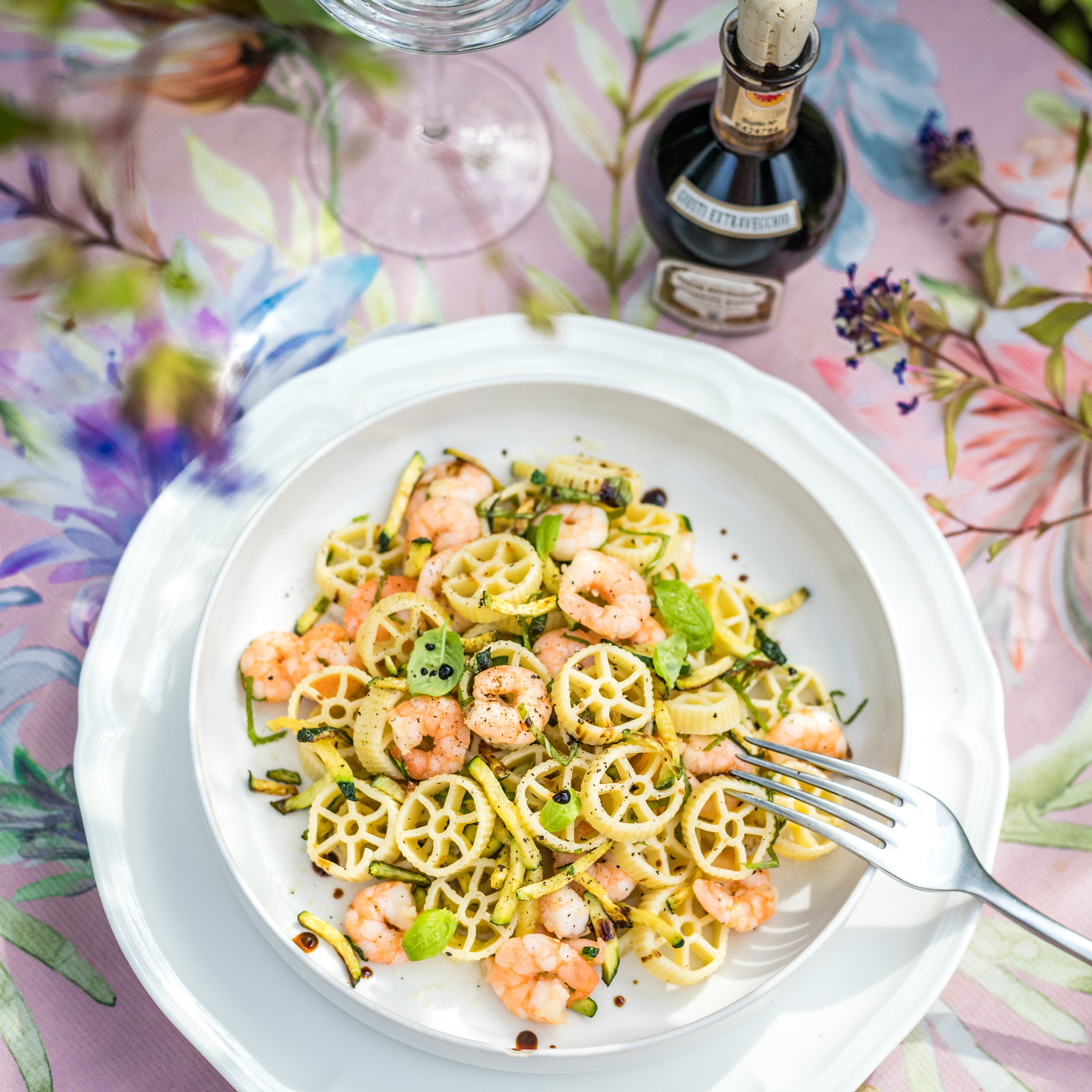 Dress the pasta with the prawns, the cooking juices, courgettes and pink pepper.