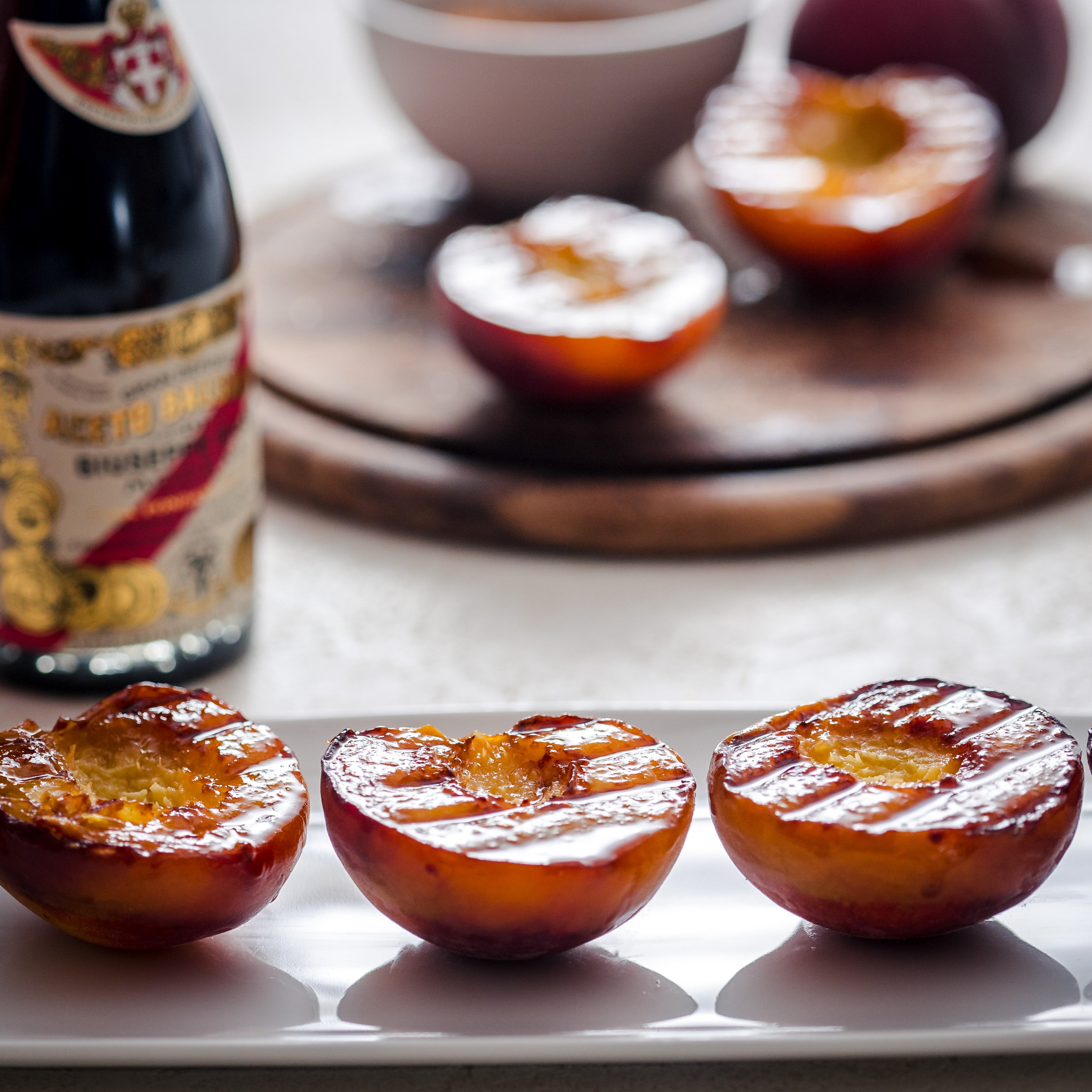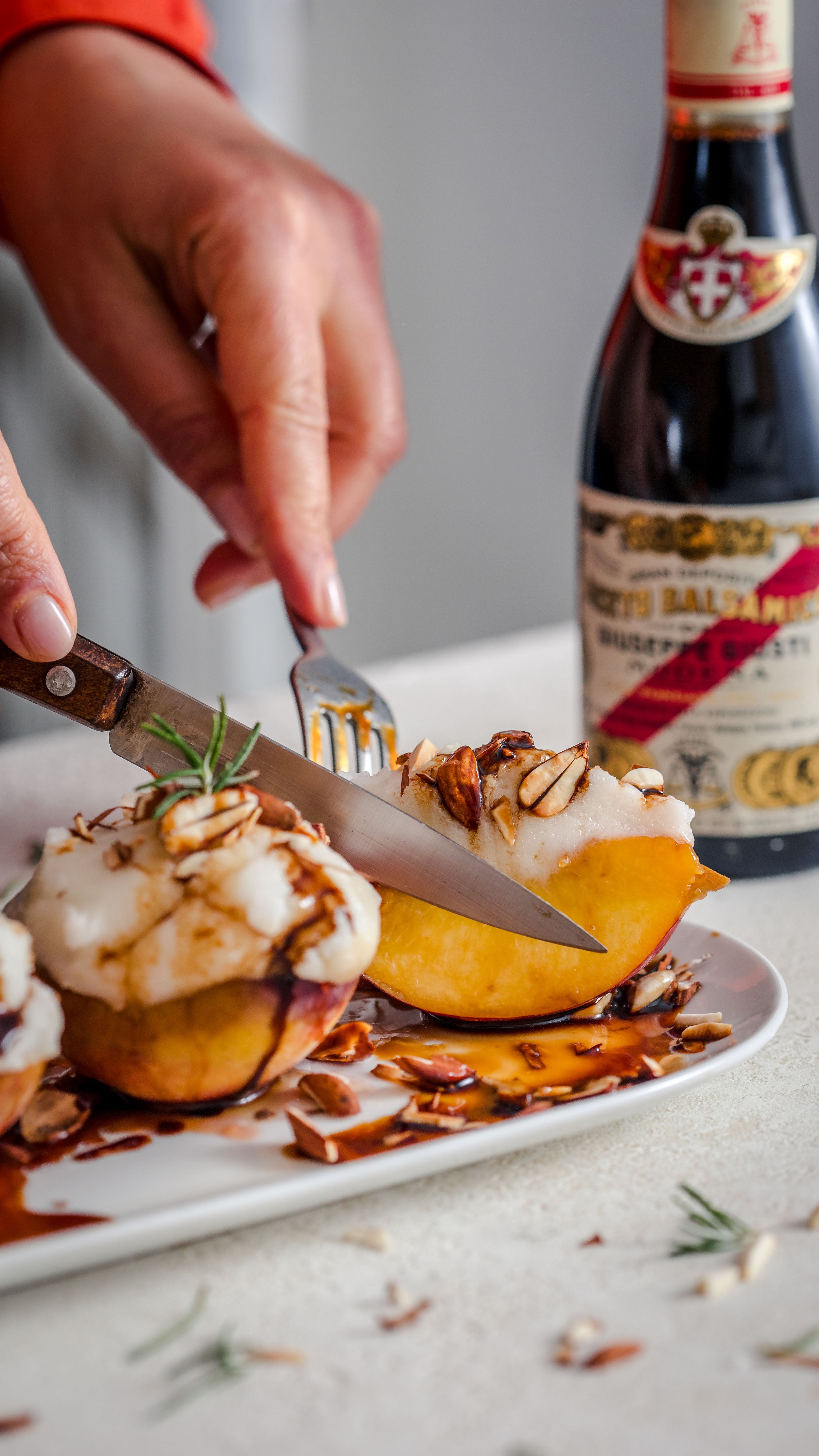 Cut the almonds into thin slices and toast them briefly in a pan, adding powdered sugar if desired. Place a scoop of vanilla ice cream in the hollow of each grilled peach half, sprinkle with toasted almonds, and finish with a drizzle of Giusti 5 Gold Medals Balsamico. Serve immediately.