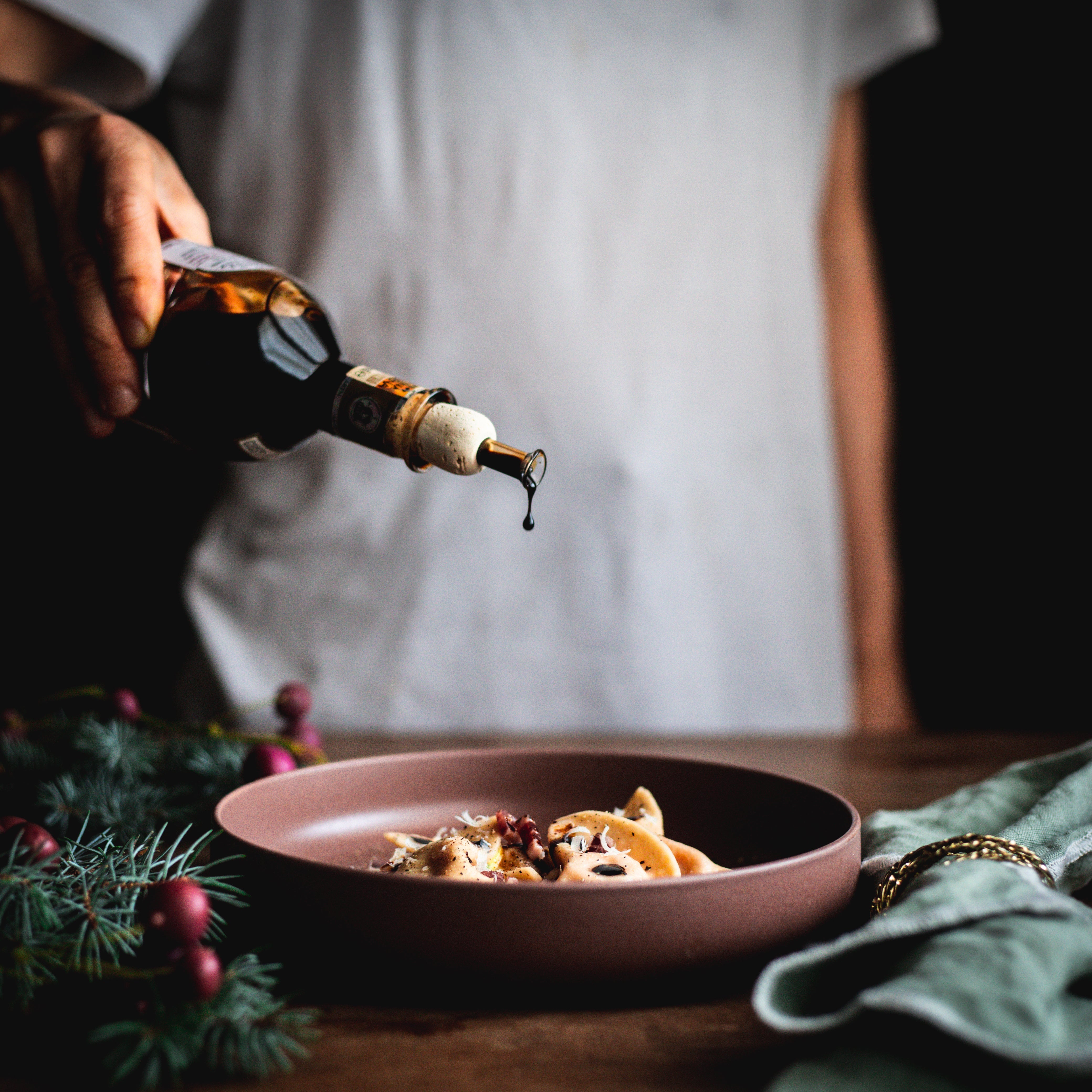 Add a generous spoonful of saffron sauce to the plate, lay the mezzelune on top, drizzle with extra virgin olive oil, add the culatello cut into small cubes, a sprinkling of Parmesan cheese and a few drops of Giusti Traditional Balsamic Vinegar of Modena “Extravecchio”.