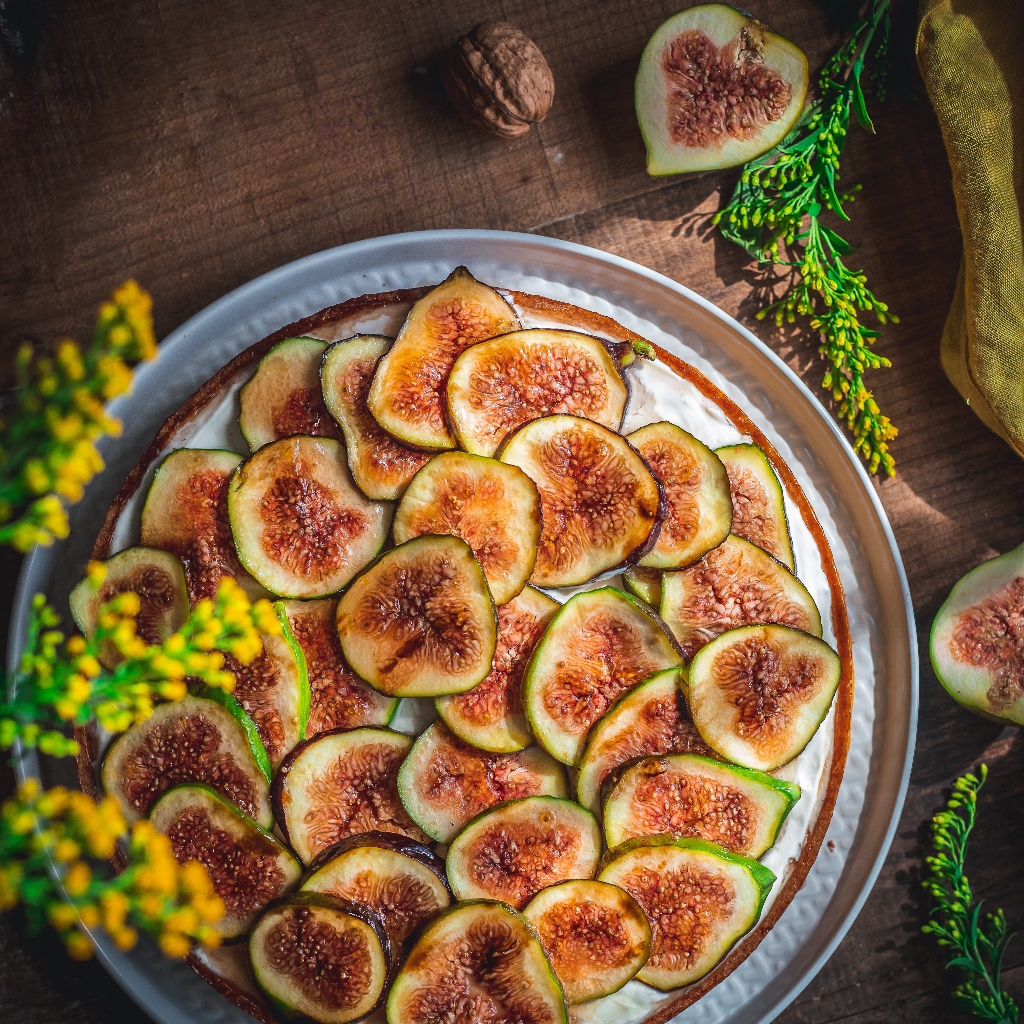 Spread the fig jam over the pastry case, then pipe the custard on top all the way to the edge. Arrange the fig slices on top. Brush with the warm honey sauce. If you like, add some toasted hazelnuts.