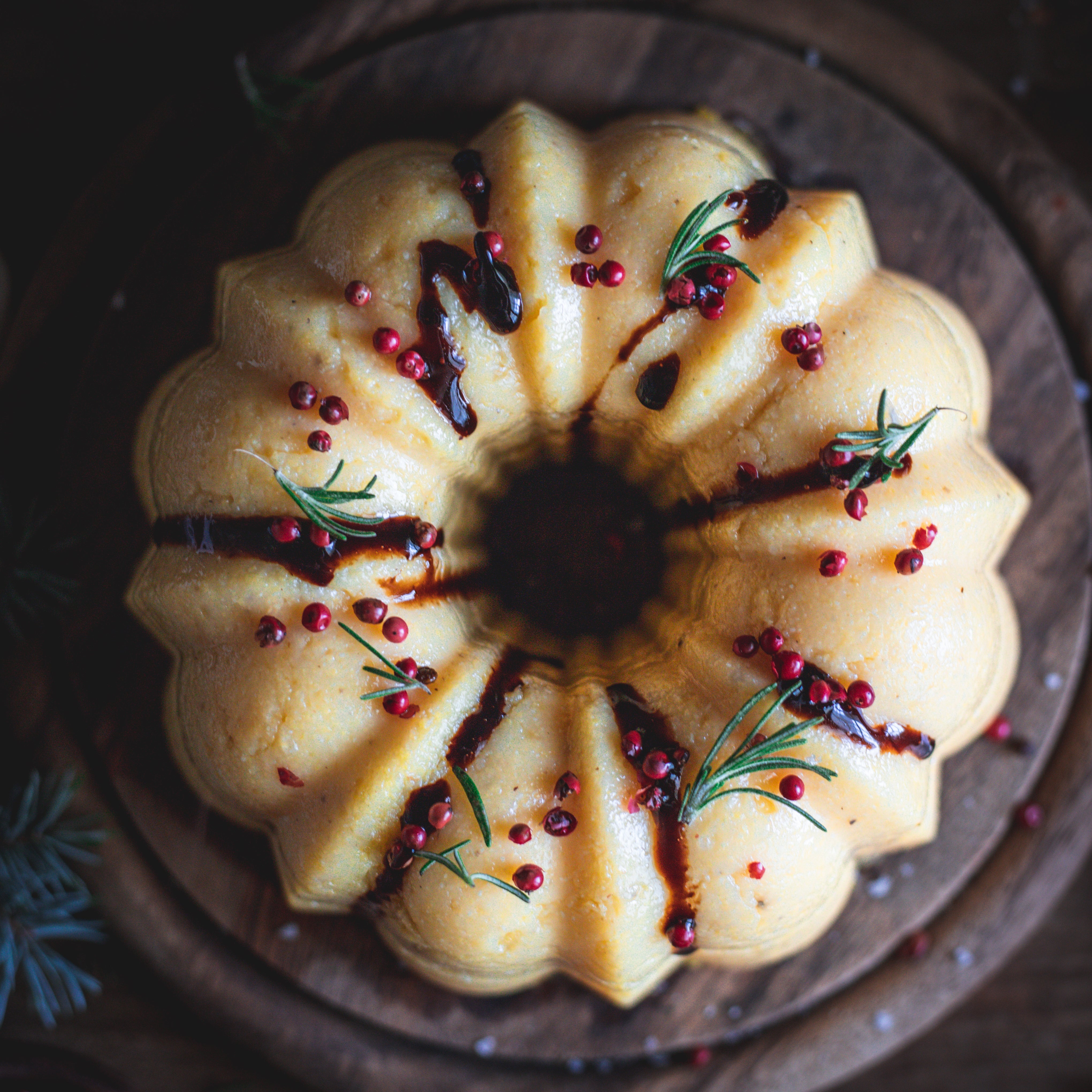 Whisk well until the mixture is smooth and then pour 2/3 of the polenta into a 1.5-litre non-stick springform ring mold, brushed with oil.