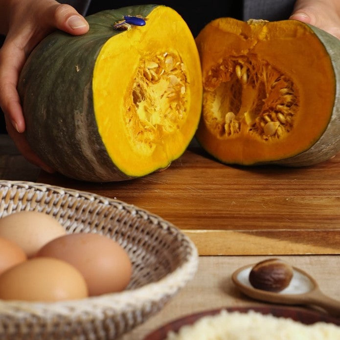 Preheat the oven in convection mode to 165°C. Cut the pumpkin into pieces, brush it with olive oil, and bake for around 25 minutes. Remove from the oven, peel, deseed, remove filaments, and let it cool to room temperature.