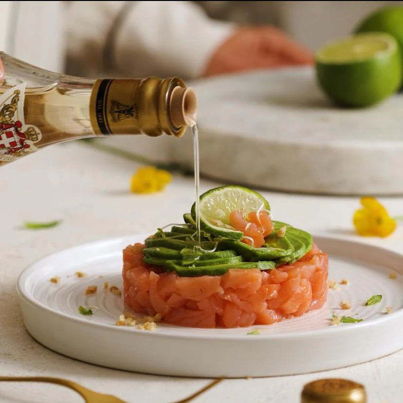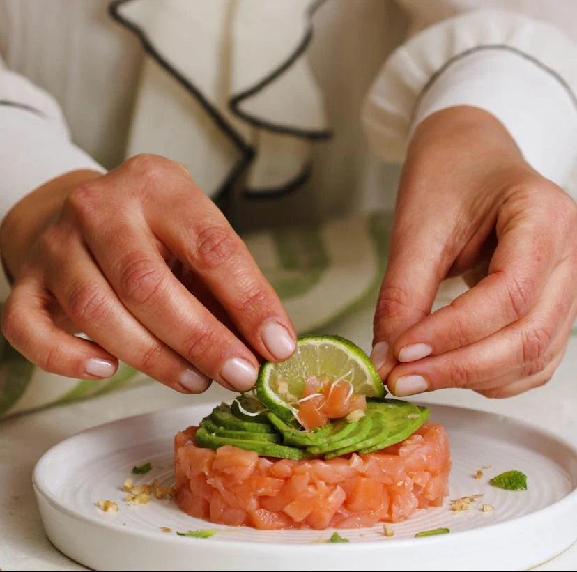 Finely dice the salmon using a sharp knife. Season with a drizzle of extra virgin olive oil, the juice of half a lime, salt, and pepper. Mix gently and let it rest in the fridge for about 10 minutes.