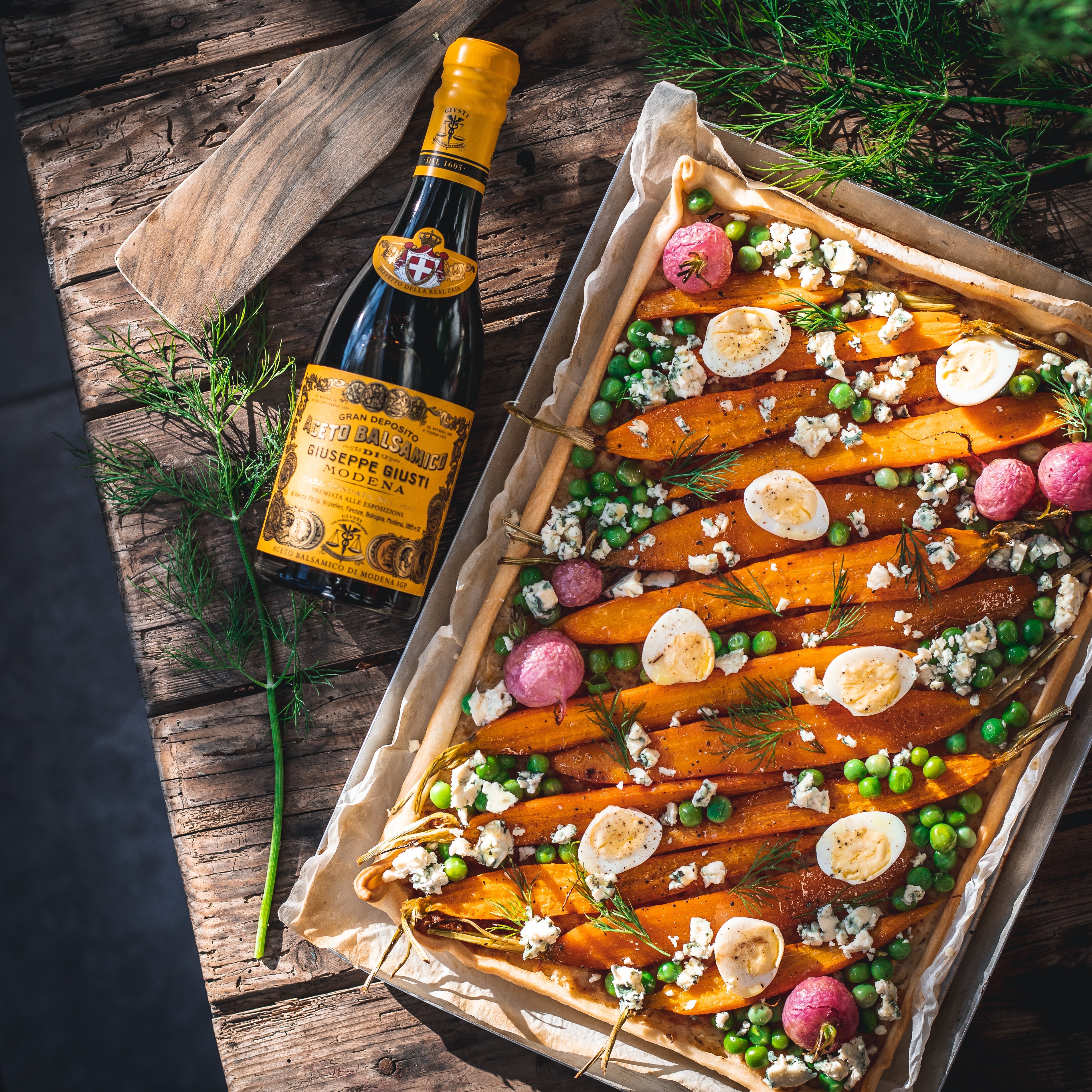 Remove the pie from the oven, top with the carrots, radishes, peas, crumbled goat's blue-veined (or feta) cheese and sprigs of dill.