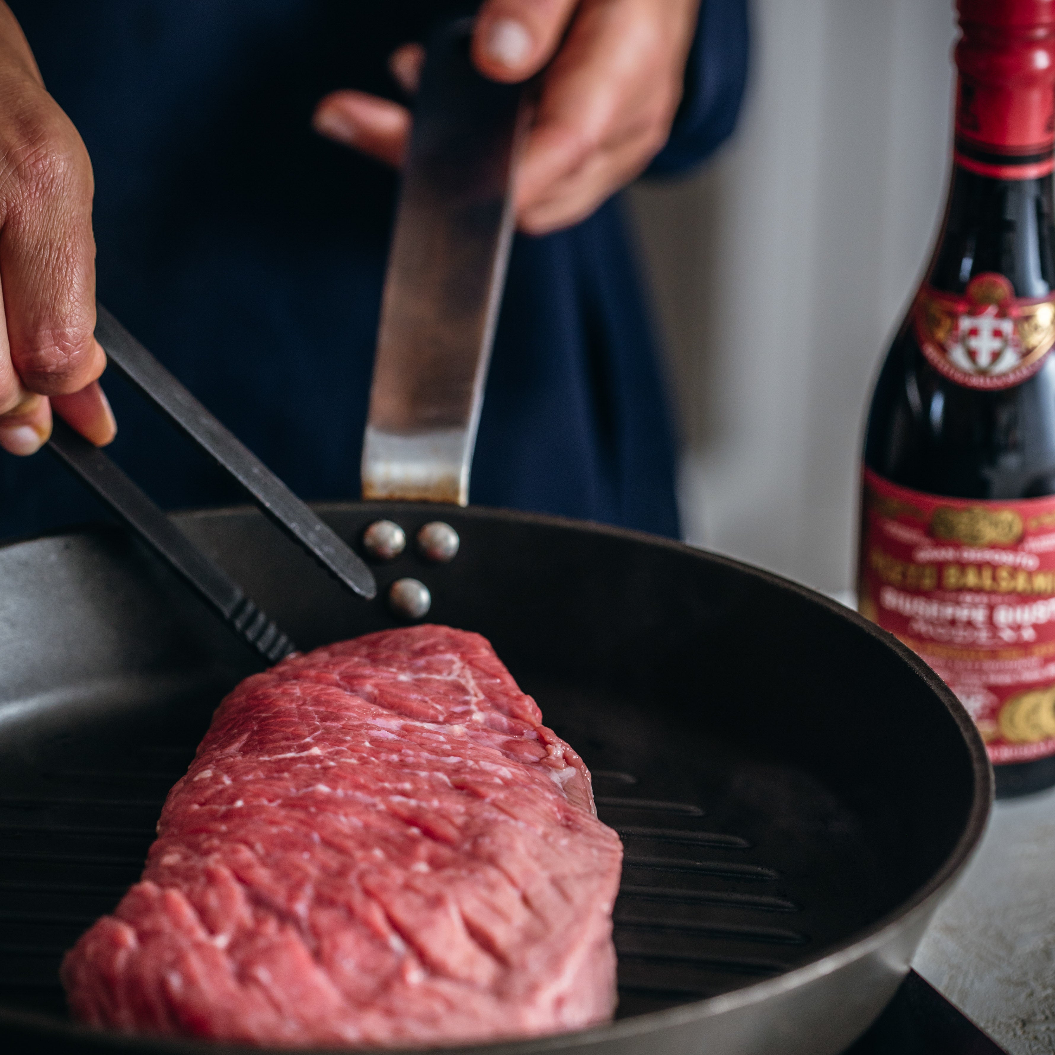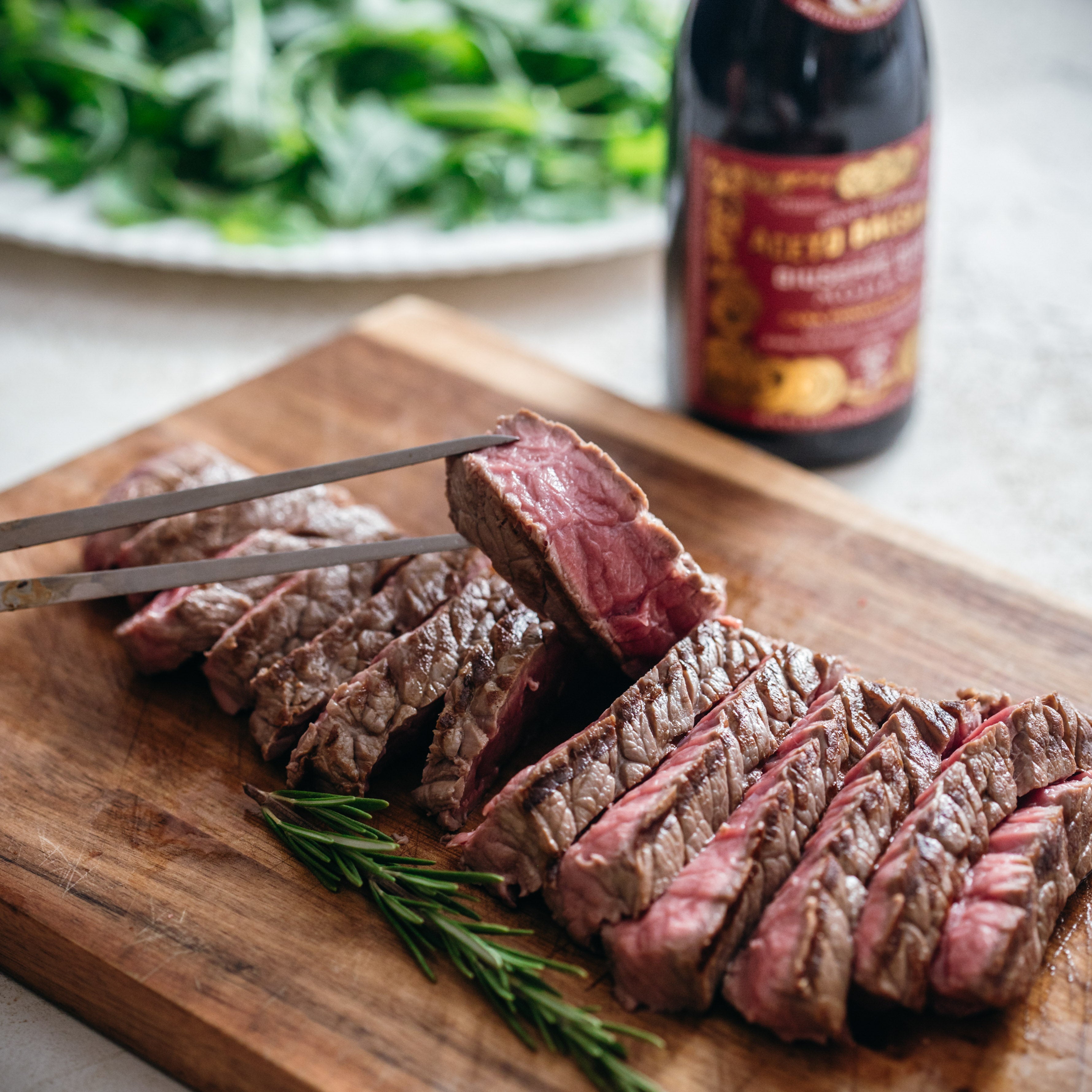 Arrange the rocket on a serving dish and season with olive oil, salt, and pepper. Cut the steak into thick slices, about 2 cm, and place them on the rocket bed. Use a peeler to shave Parmigiano onto the meat. Drizzle with Giusti 3 Gold Medals Balsamico.