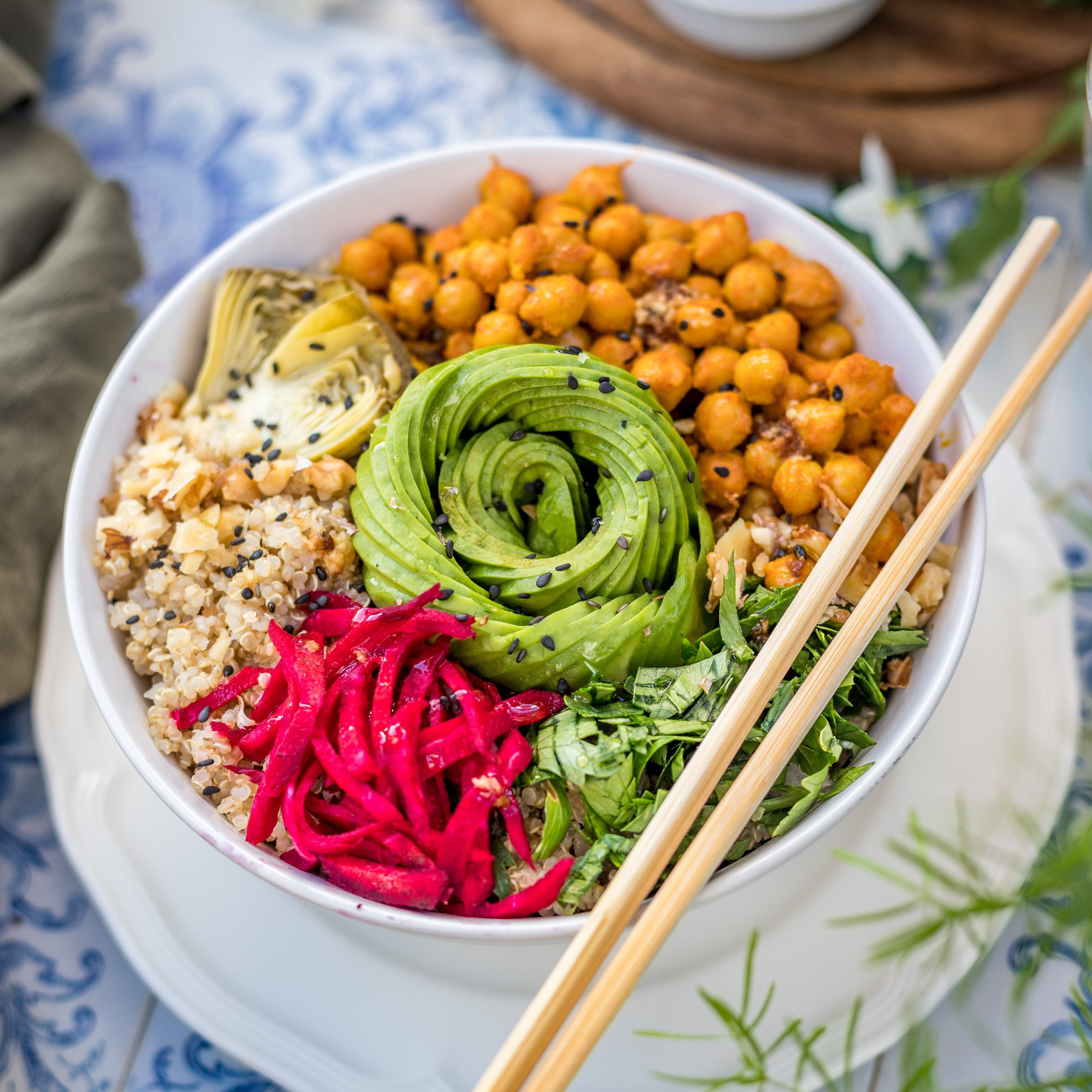 Add the chickpeas, basil, beetroot and finish with the avocado rose and the artichoke cut in half.