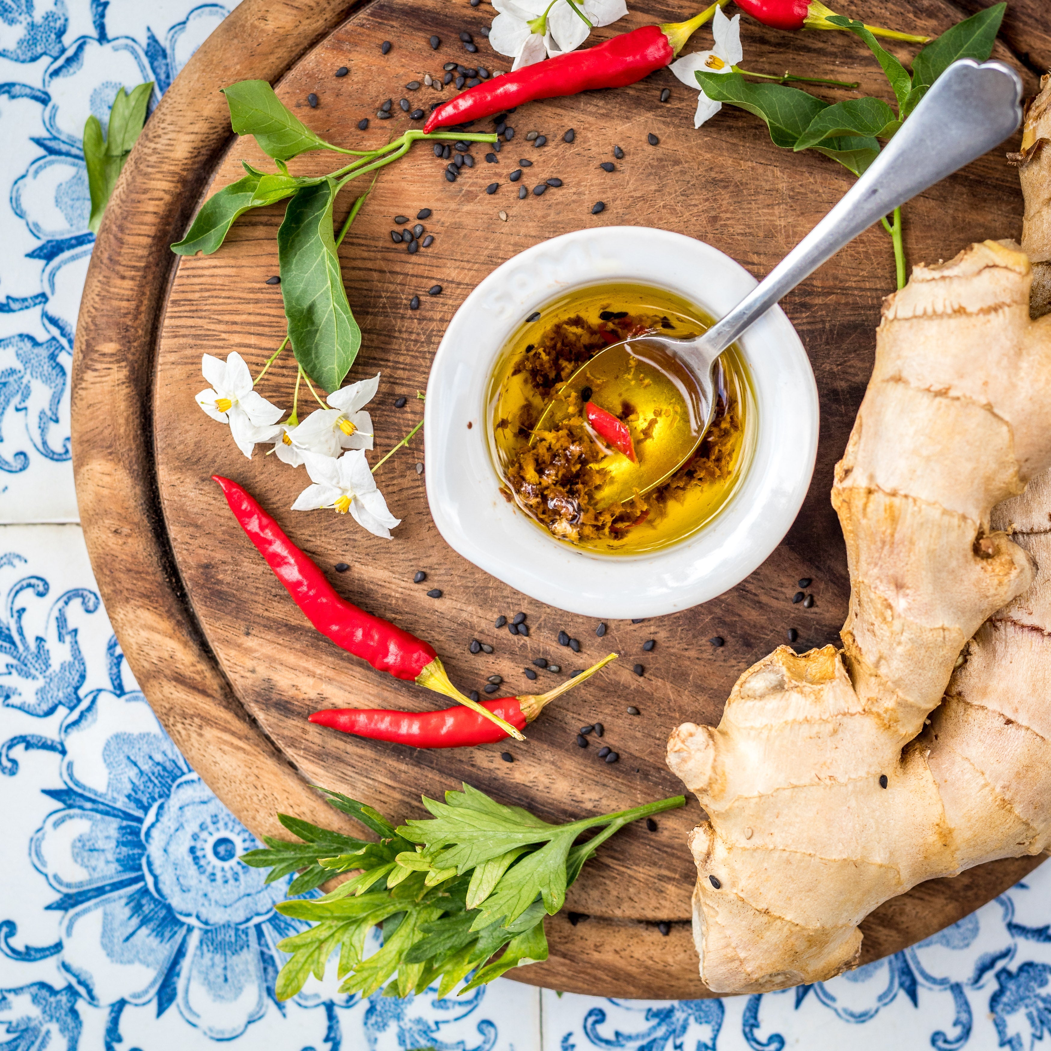Finely grate a small piece of ginger into a small saucepan. Add the oil, chilli pepper and peeled garlic clove.