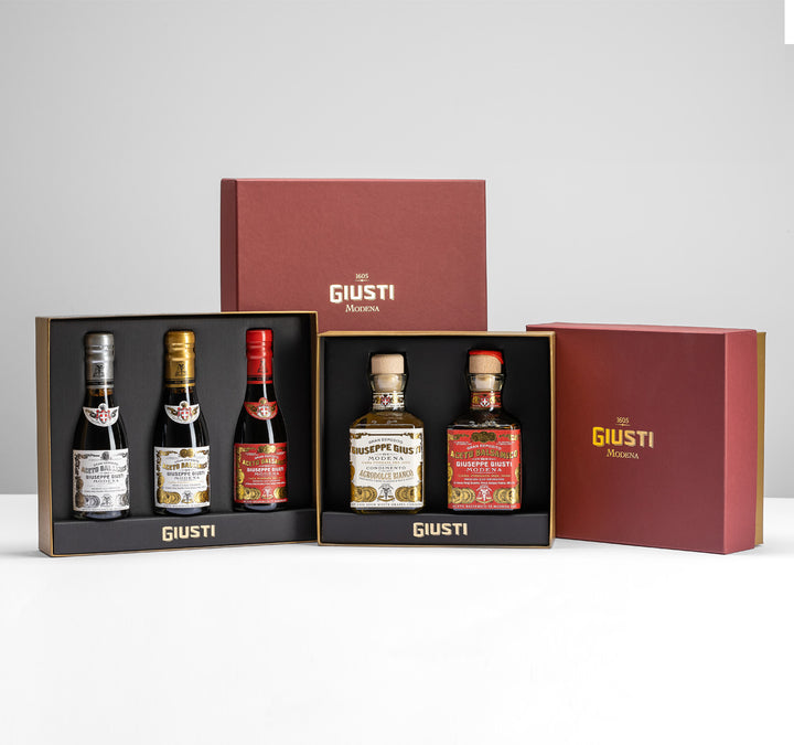 Elegant boxes containing three small products, providing a flavorful journey through Giusti products.