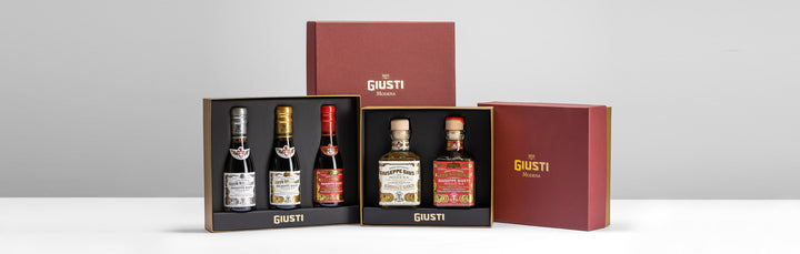 Elegant boxes containing two cubic bottles, offering perfect pairings for a great tasting experience of Giusti products.